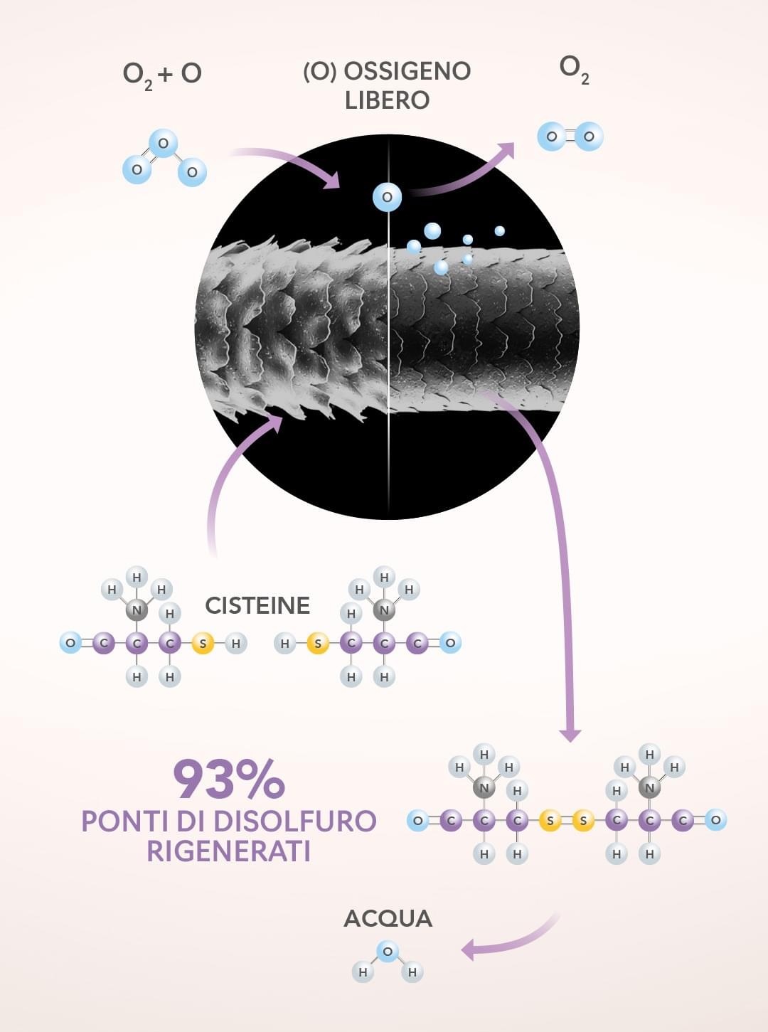 L’ossigeno libero si lega naturalmente alla struttura cheratinica dei capelli, rigenerando i legami modificati dai servizi tecnici e restituendo loro la naturale struttura, grazie alla chiusura delle cuticole.